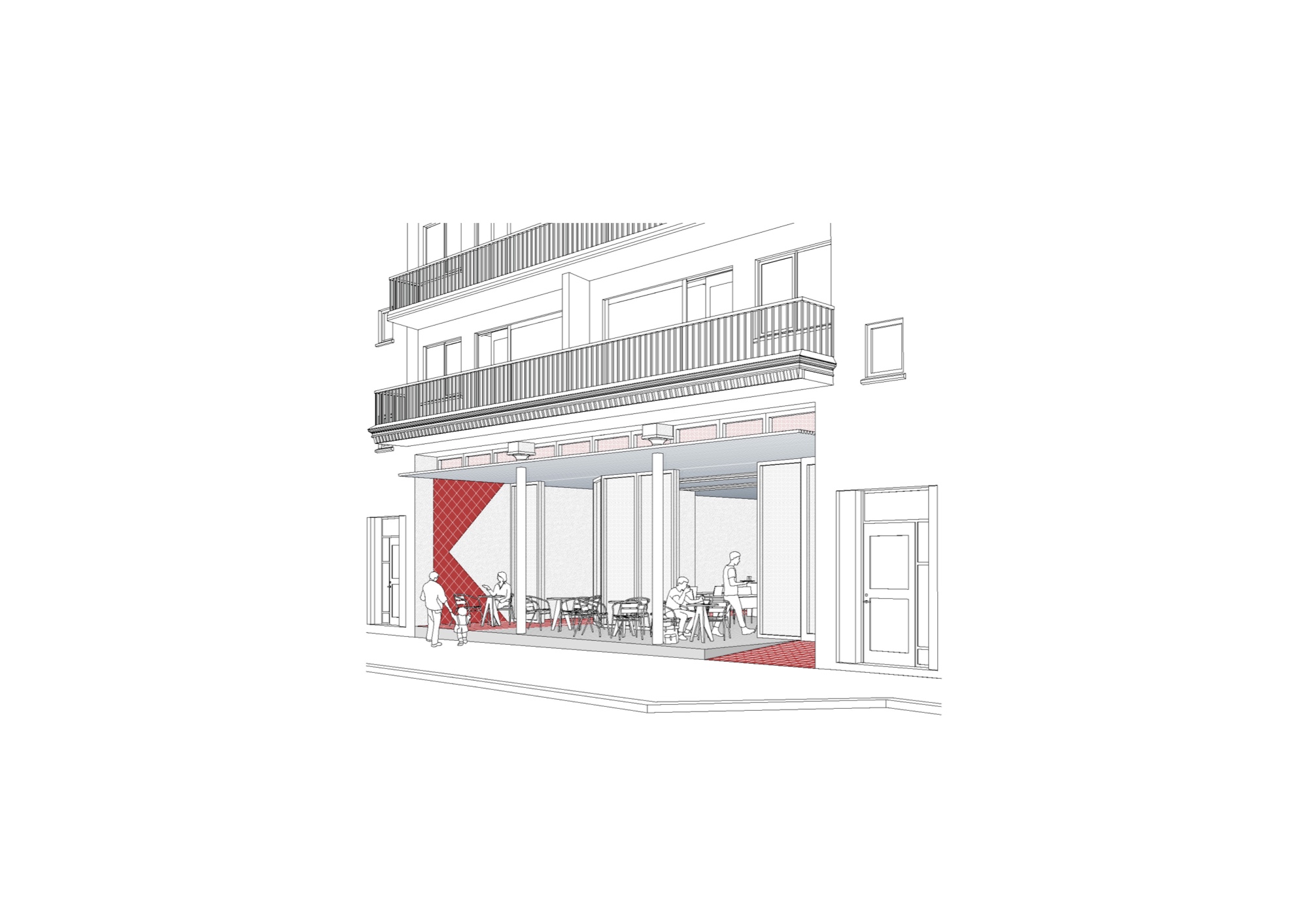 Aan de Kerkstraat planden we, naast de toegang, het café met achterliggend leslokaal. Daartoe ontdeden we de gietijzeren gevelkolommen van hun jaren ’60-betimmering en gaven ze ruimte door de glazen wand naar achter te schuiven, zodat een loggia ontstond. Op de zijwanden van de loggia wezen pijlen uitwaarts naar de straat: een bondige vertaling van de opdracht van integratie in de maatschappij.