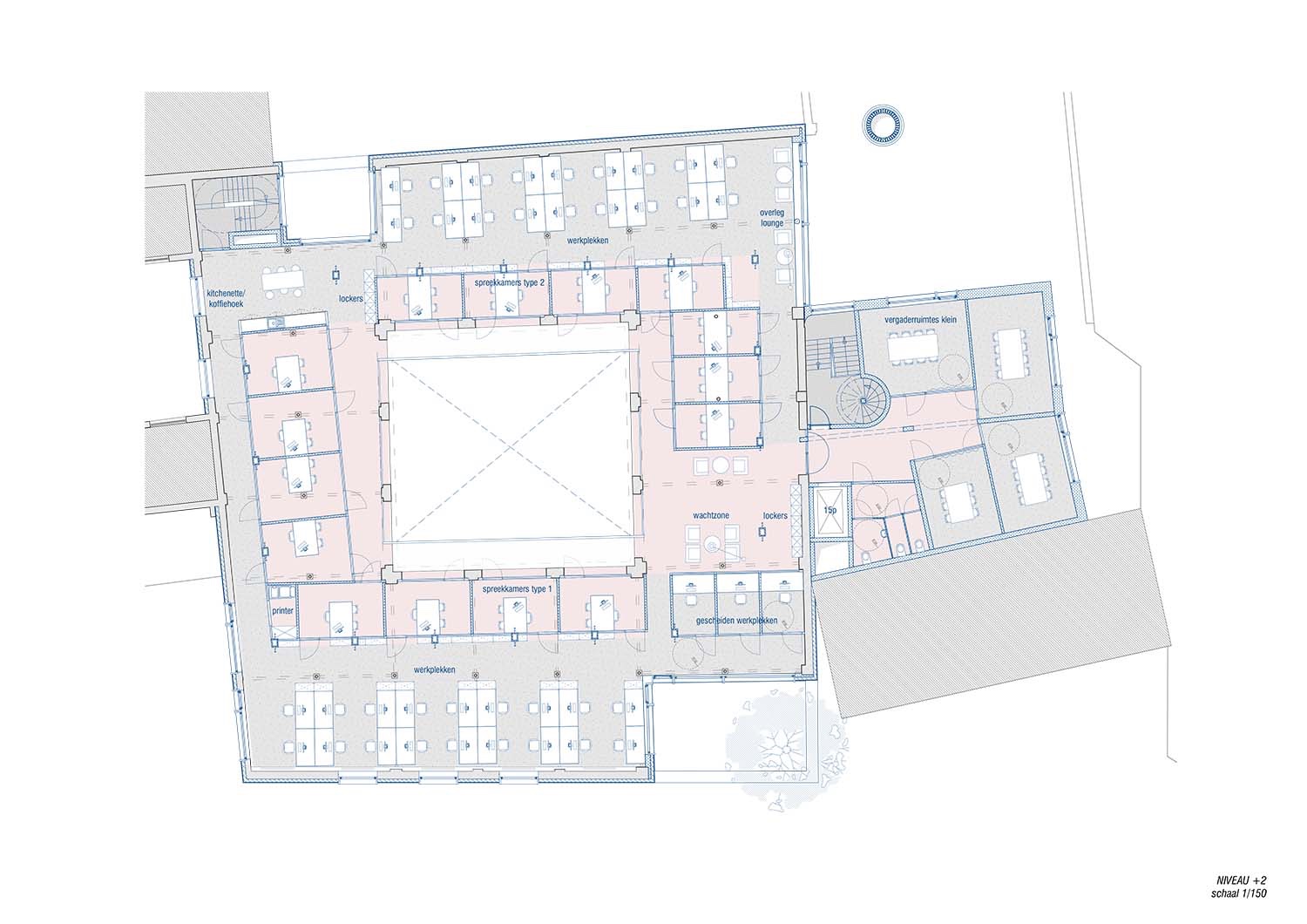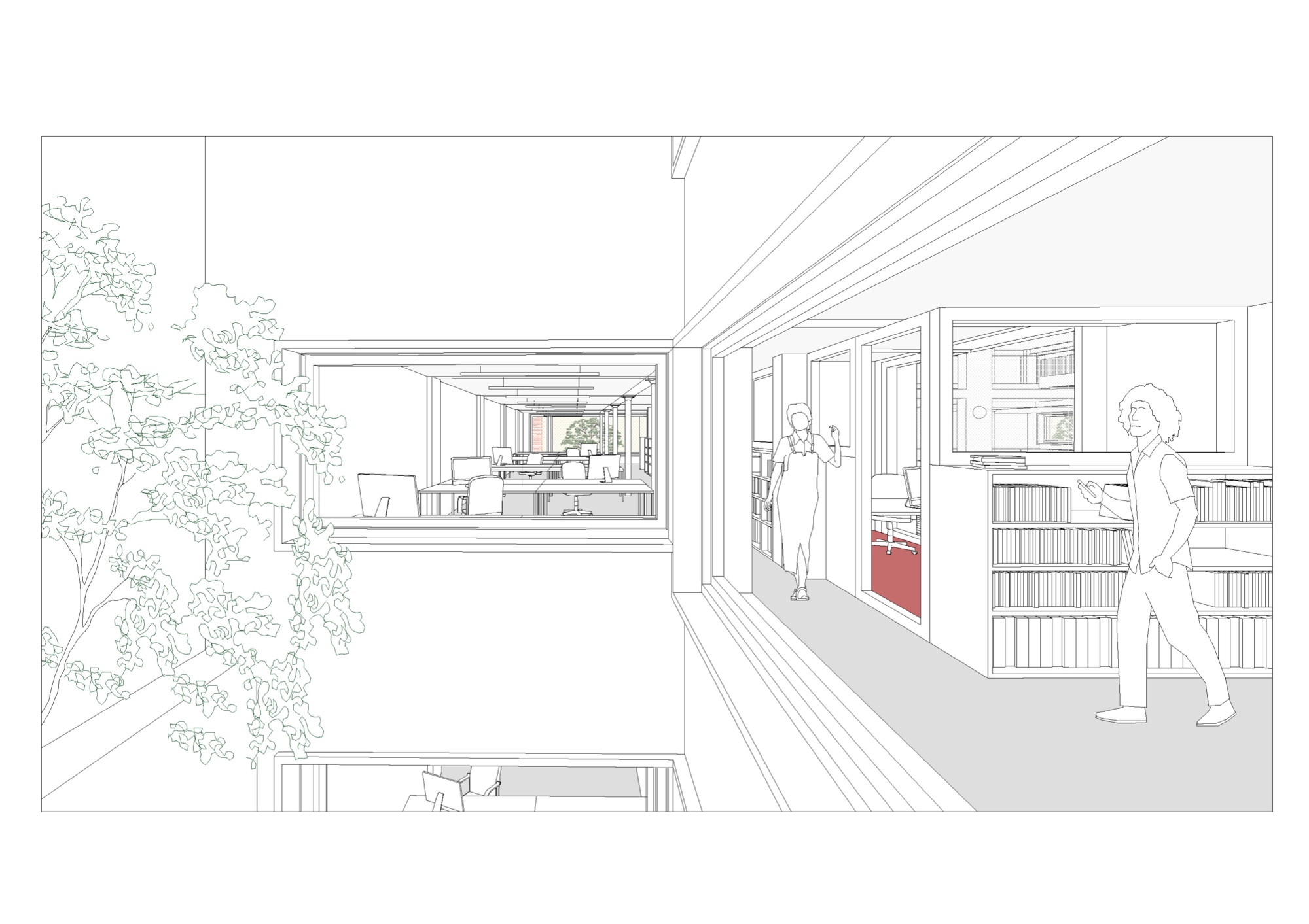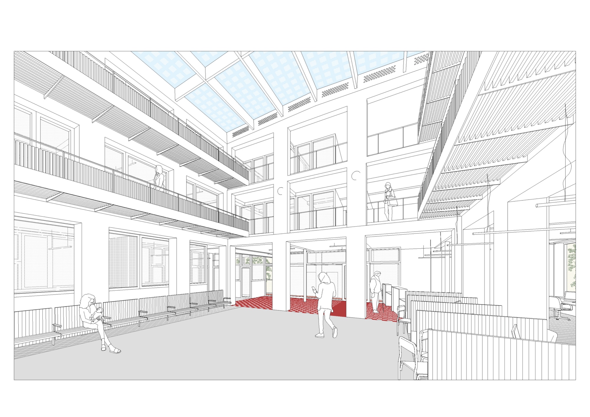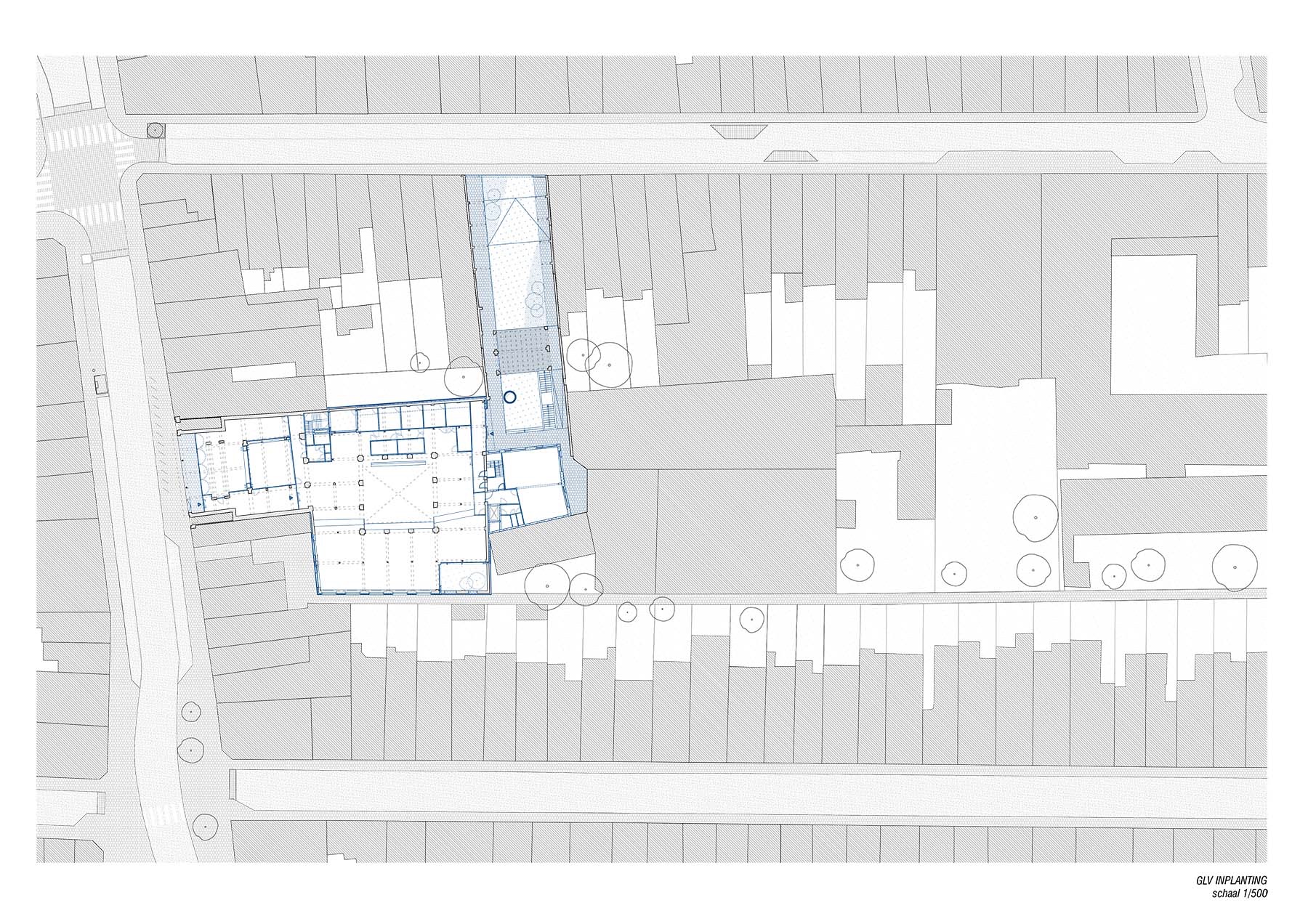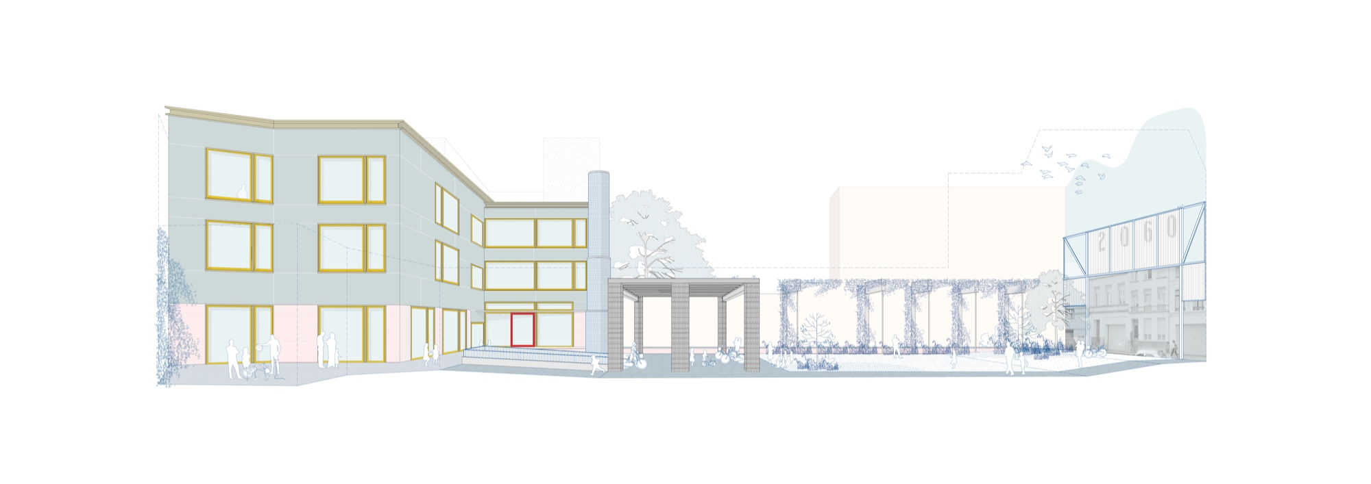 Het bewaren van het atriumgebouw, dat enige erfgoedwaarde heeft, moest gecompenseerd worden door het ontpitten en ontharden van het resterende binnengebied. Het programma, een onthaalkantoor voor nieuwkomers in de stad, moest met een gastvrije, vriendelijke aanwezigheid in beide straten de onzichtbaarheid van het atriumgebouw compenseren.