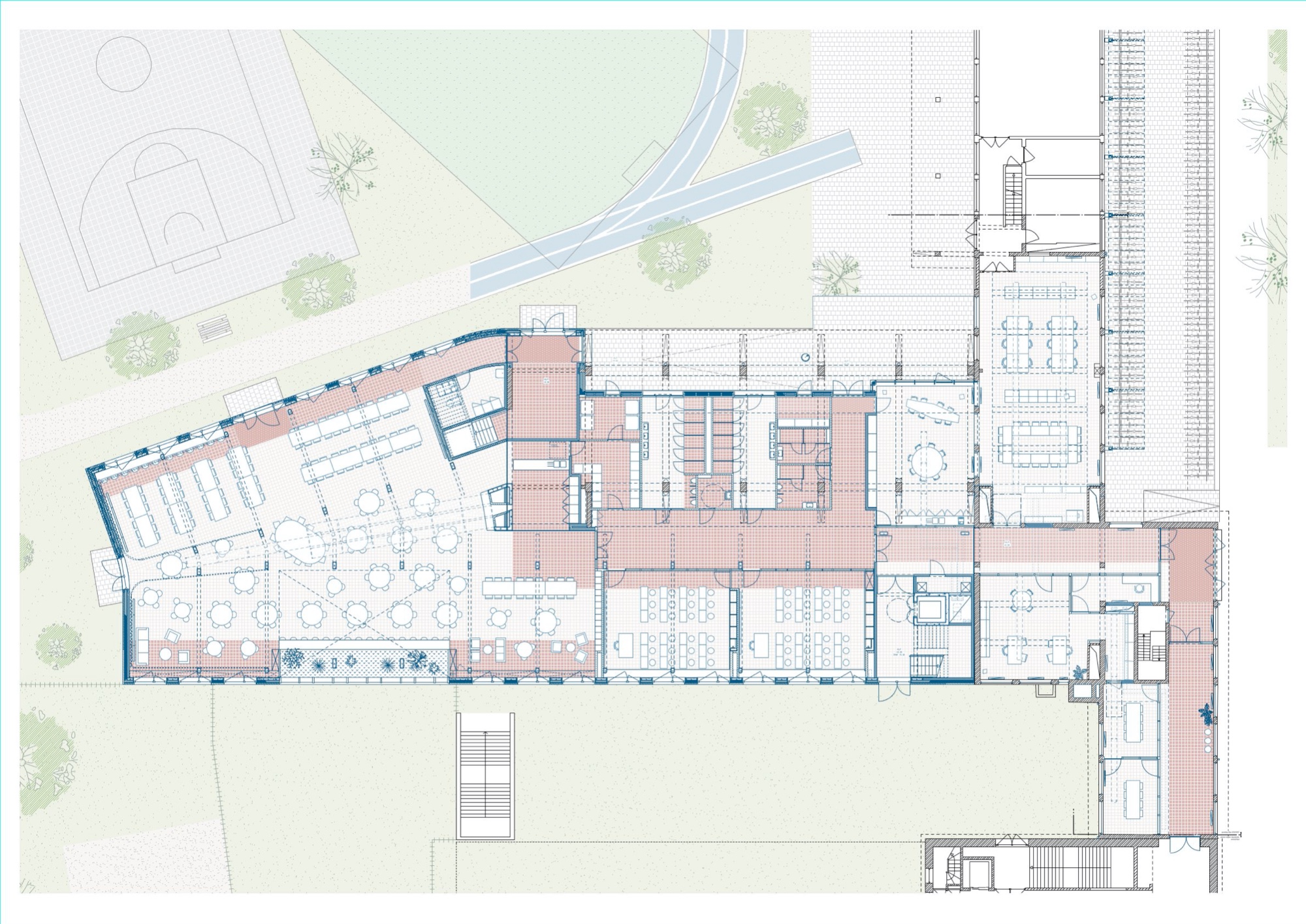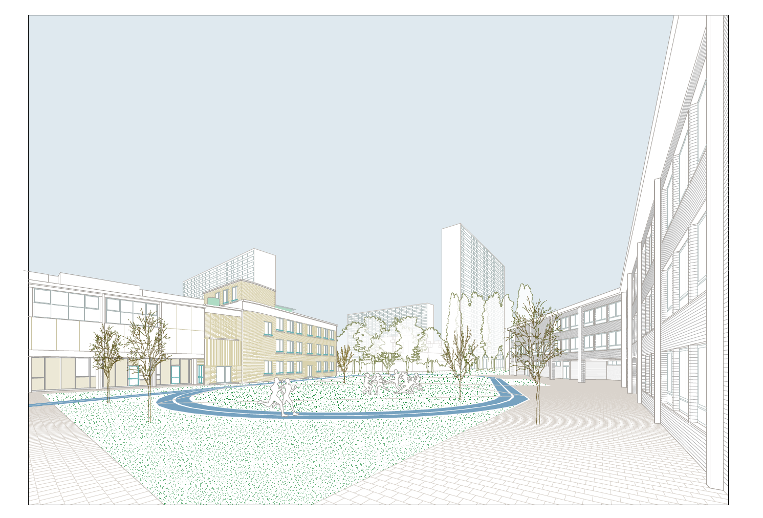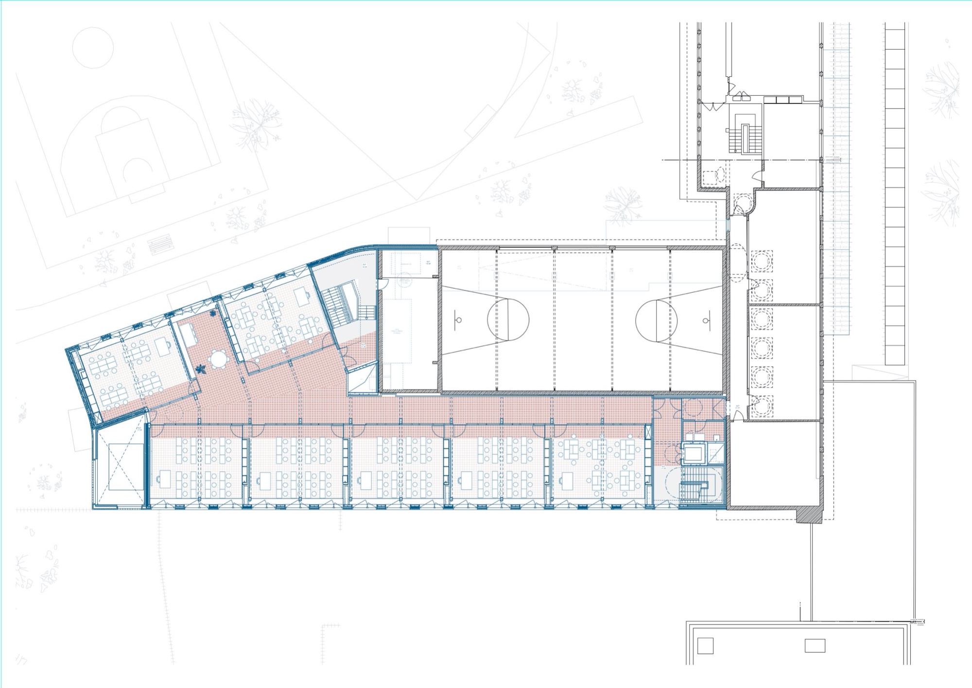 De nieuwbouw haalt obstakels weg uit de schoolcircuits en verbindt de nieuwe met de oude lokalen. Twee trappenkernen vervangen ongelukkig geplaatste vluchttrappen. Een portiekenstructuur vermijdt nieuwe lasten op de bestaande turnzaal en garandeert latere aanpasbaarheid. De portieken kennen twee richtingen. Aan de zuidkant zijn ze evenwijdig met de turnzaal, aan de noordkant loodrecht op de looppiste. Ze reiken naar elkaar en sperren de lineaire vleugel open. Met drie gevelopeningen voor twee portieken en onafhankelijk geplaatste houten wanden worden veel ruimtematen mogelijk. Het ontwerp van de lichte wanden anticipeert op mogelijke nieuwe posities voor deuren; in de wand geïntegreerde luchtroosters garanderen de ventilatie bij een nieuwe indeling. De polyritmiek van structuur, gevel, lichte wanden en installaties creëert lokalen die tegelijk apart en verbonden blijven. Kleurveranderingen in de vloer die niet samenvallen met de binnenwanden relativeren de scheiding. Dit principe, articulatie zonder opdeling, is het sterkst in de polyvalente ruimte, waar een vide en een serre de doorzichten nog vermeerderen.