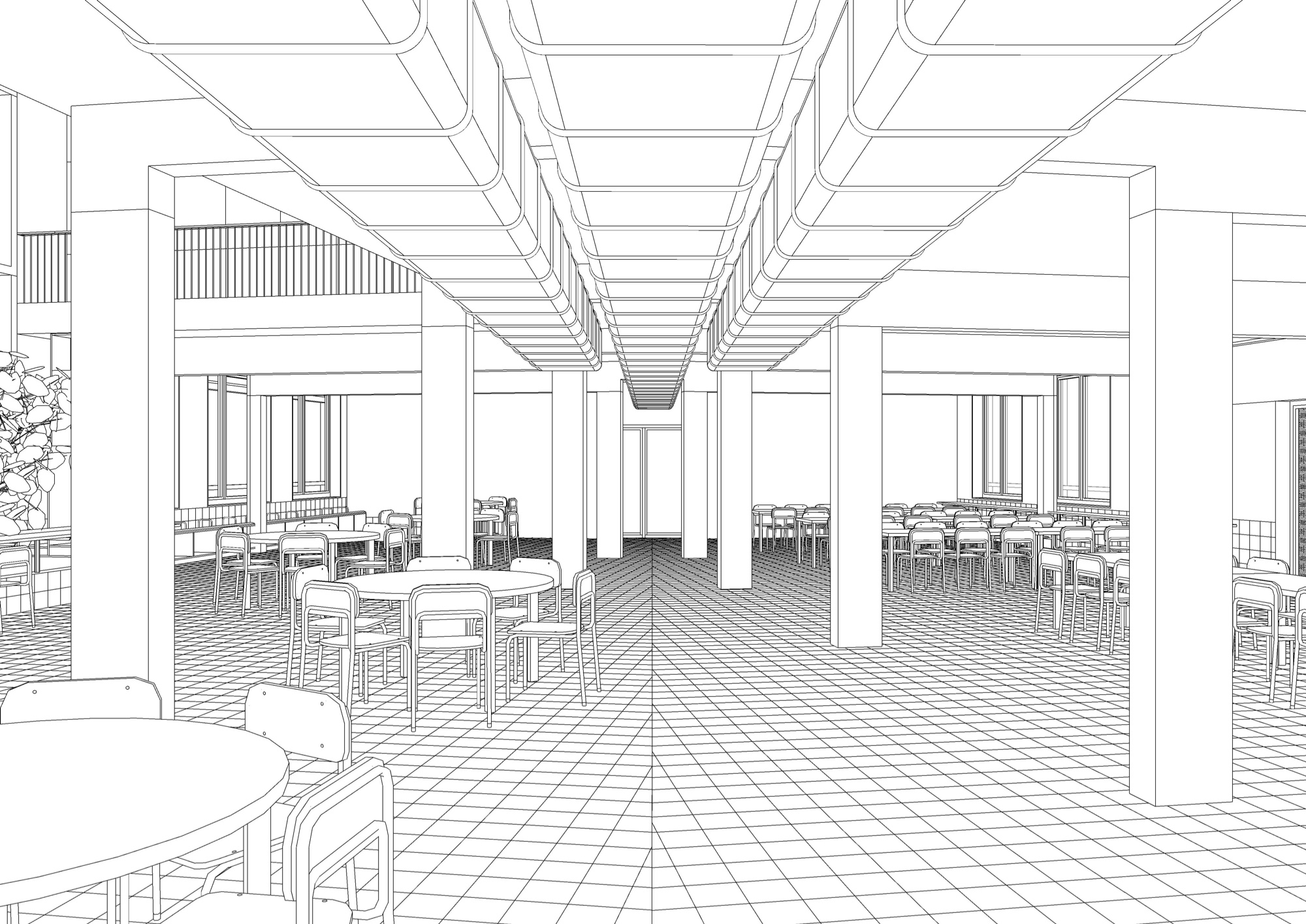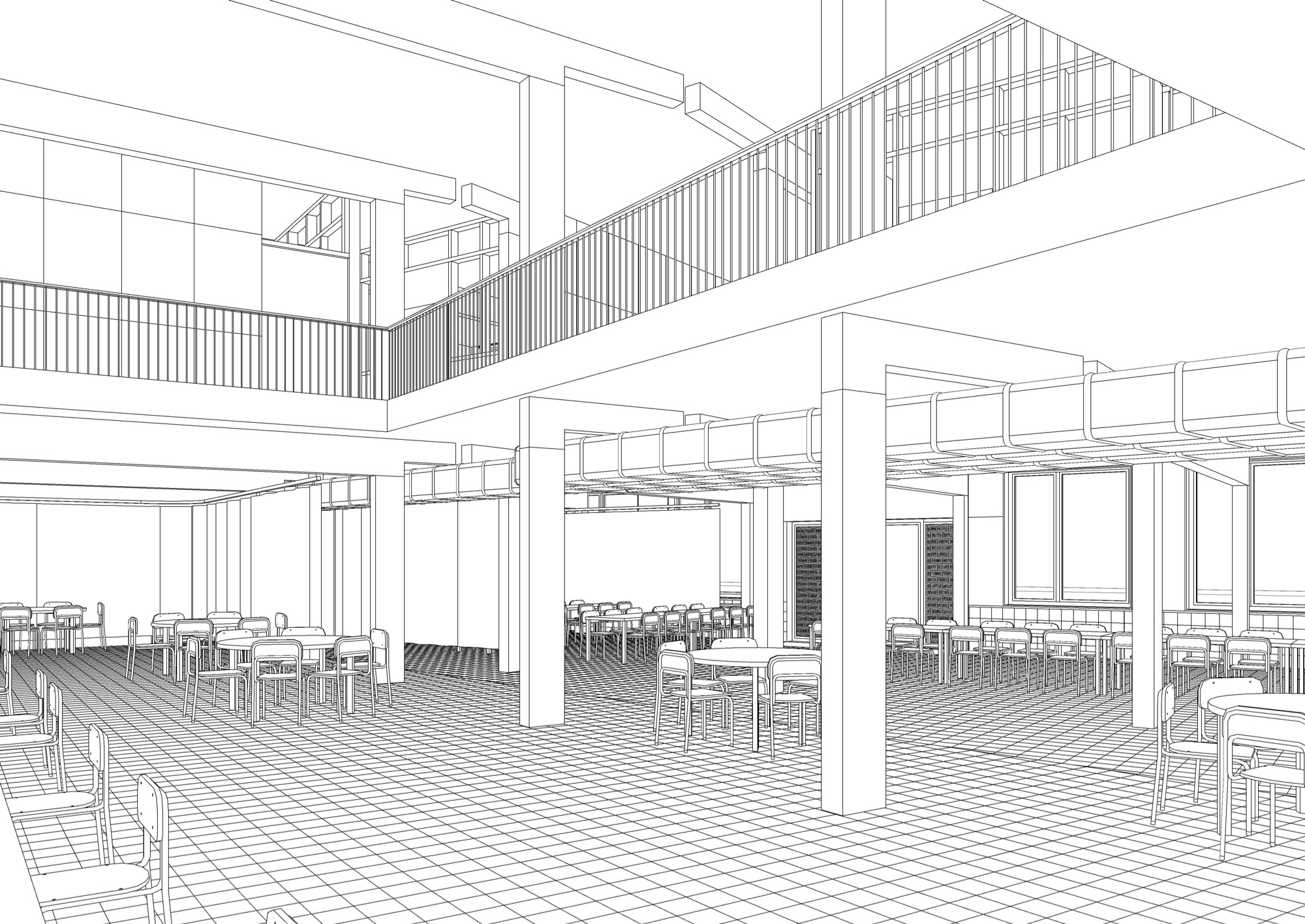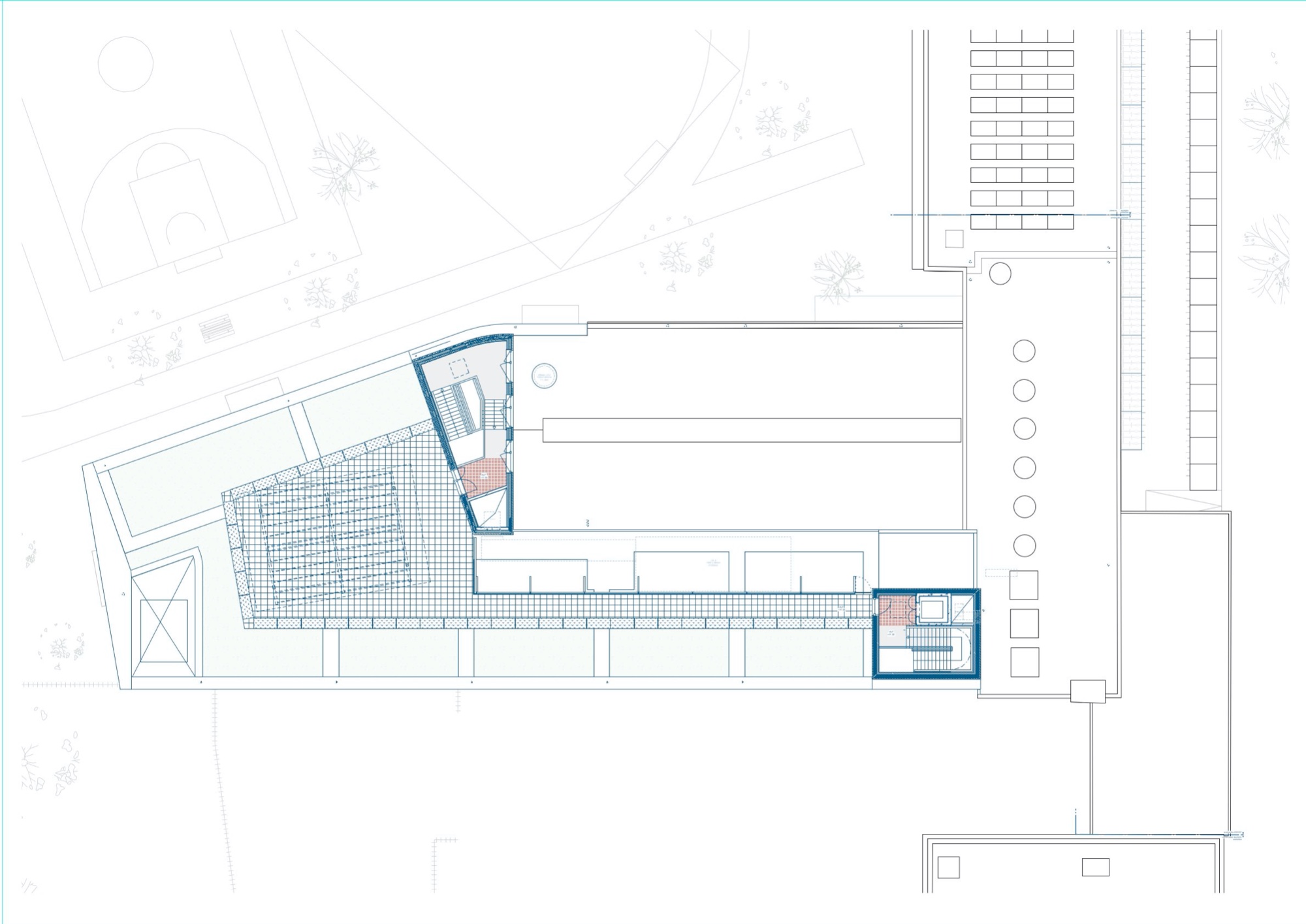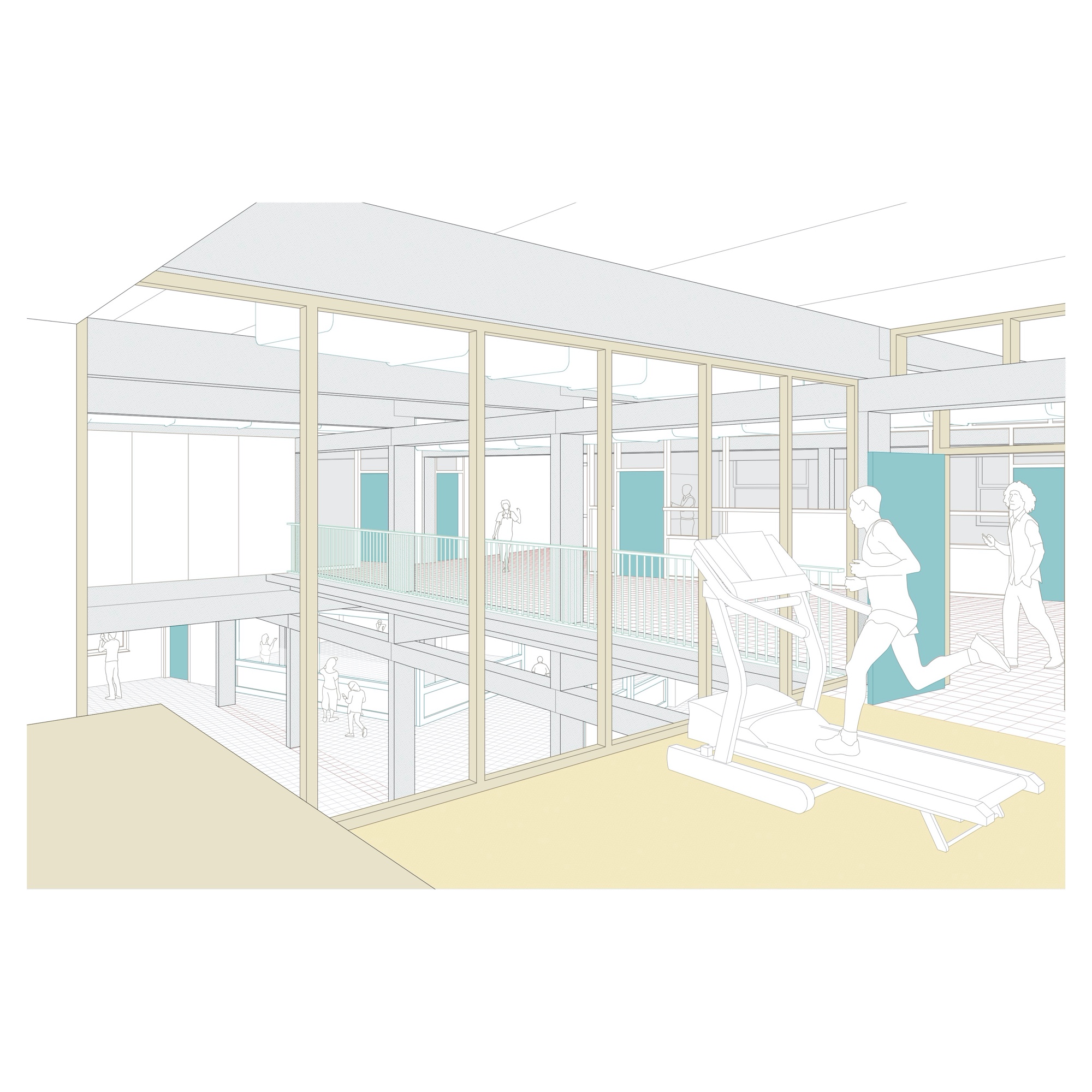 De nieuwbouw haalt obstakels weg uit de schoolcircuits en verbindt de nieuwe met de oude lokalen. Twee trappenkernen vervangen ongelukkig geplaatste vluchttrappen. Een portiekenstructuur vermijdt nieuwe lasten op de bestaande turnzaal en garandeert latere aanpasbaarheid. De portieken kennen twee richtingen. Aan de zuidkant zijn ze evenwijdig met de turnzaal, aan de noordkant loodrecht op de looppiste. Ze reiken naar elkaar en sperren de lineaire vleugel open. Met drie gevelopeningen voor twee portieken en onafhankelijk geplaatste houten wanden worden veel ruimtematen mogelijk. Het ontwerp van de lichte wanden anticipeert op mogelijke nieuwe posities voor deuren; in de wand geïntegreerde luchtroosters garanderen de ventilatie bij een nieuwe indeling. De polyritmiek van structuur, gevel, lichte wanden en installaties creëert lokalen die tegelijk apart en verbonden blijven. Kleurveranderingen in de vloer die niet samenvallen met de binnenwanden relativeren de scheiding. Dit principe, articulatie zonder opdeling, is het sterkst in de polyvalente ruimte, waar een vide en een serre de doorzichten nog vermeerderen.