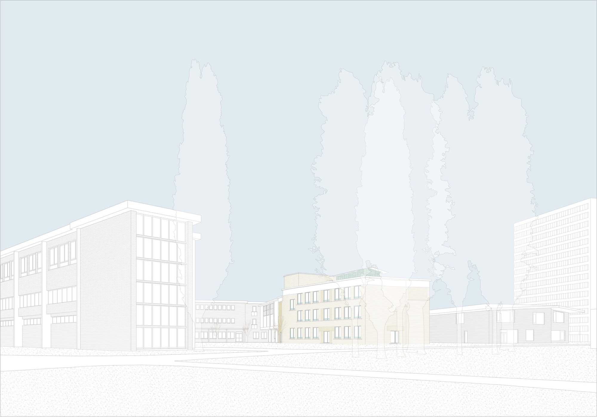 De drie naar het Europark gekeerde vleugels zijn allen anders. Waar de noordelijke schoolvleugel hoog en slank, utilitair en repetitief is, lijkt de buurtsporthal op een schuur, met daken met wolfseinden en overstekken. Onze middenste vleugel bemiddelt tussen beiden. Hij is breed en stevig, maar versmalt naar het eind. In de polyritmische gevels onderbreken afwijkende motieven de repetitie voor bijzondere momenten. De overstek van de eindgevel, een gebaar naar het park, is ranker en hoger dan aan de buurtsporthal. “Parasieten”, lichte, onafhankelijke stalen opbouwen animeren de skyline voor de parkbezoeker en het dakvlak voor de torenflatbewoners met een vleugje speelse overmoed.