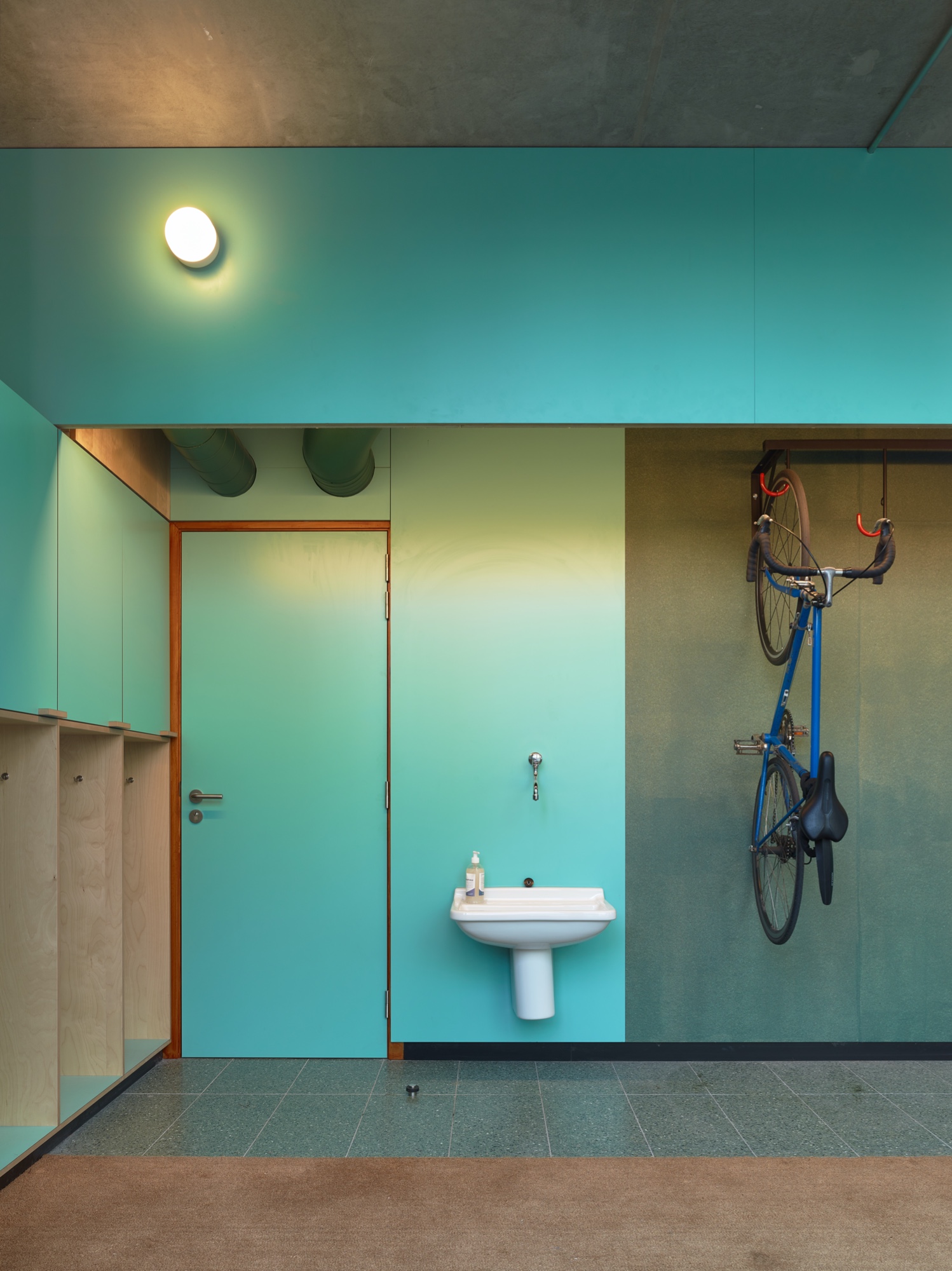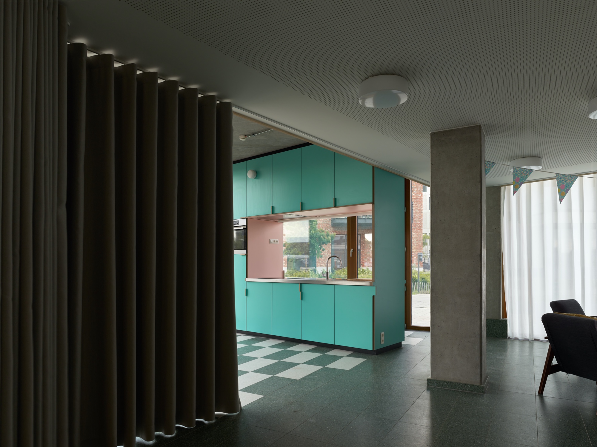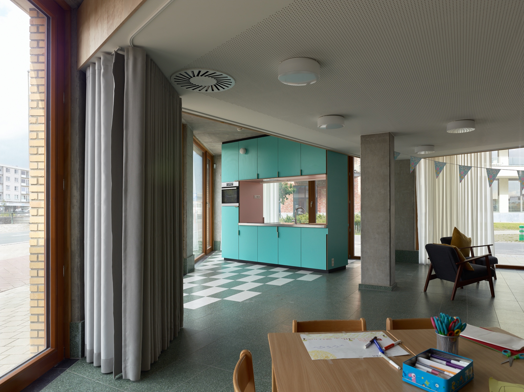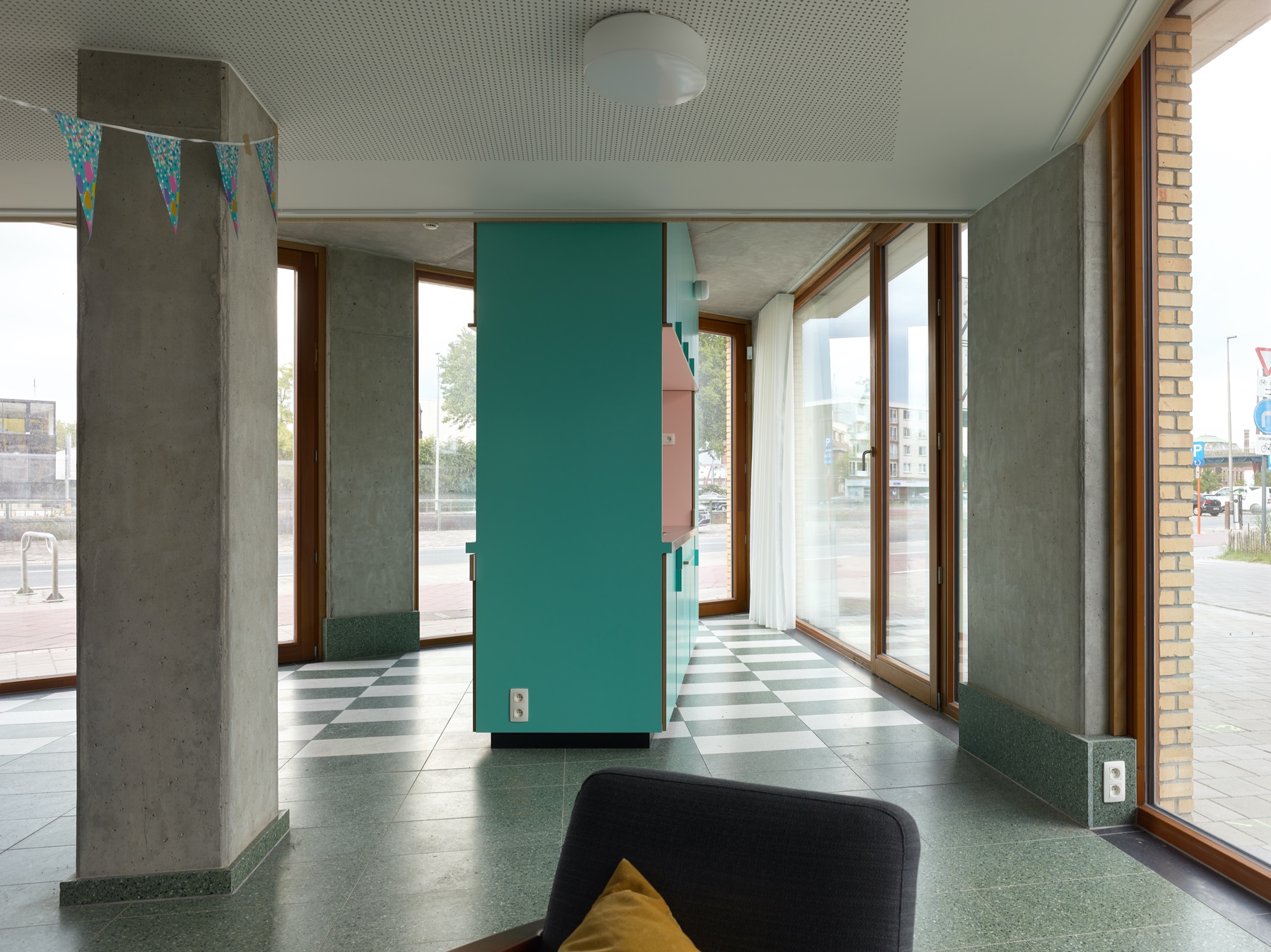 De spitse hoek, aan weerskanten beglaasd, van het door ons ontworpen Tondelier Krono-gebouw kreeg geen commerciële, maar een sociale invulling: een clubhuis voor de stedelijke kinder- en jeugdwerking vzw Jong. De geometrie, doorkruist door structuurelementen, is bijzonder. De ingang zit in het smallere plandeel, met genoeg ruimte voor de jassen en spullen van de kinderen, en om go-carts of ander rollend materiaal op te stellen, voor uitjes in het park. Hier kunnen ook de handen gewassen worden na het buiten spelen. Hoewel het sanitair van de sportzaal vlakbij is, koos de opdrachtgever voor eigen sanitair. In de kelder van het gebouw is een ruime berging, bereikbaar met de lift. De driehoekige casco ruimte wordt ergonomisch opgedeeld zonder wanden, enkel met plafond- en vloerpatronen. Hoge plinten bieden plaats voor stopcontacten, zonder in het beton te hoeven slijpen. Een vijfhoekig verlaagd plafond verbergt leidingen en een balk, dempt het geluid en begeleidt een gordijn, dat dicht kan om te gamen of een film te kijken. Het hangt niet voor de grote ramen, maar verbindt de penanten, zodat een aparte ingeschreven ruimte ontstaat. Daarbuiten, in de punt van de driehoek, staat de pannenkoekenkeuken, met alle keukengerei erin en open aan beide kanten, zodat iedereen kan meedoen. De materialen en kleurstelling die aansluiten bij de rest van het gebouw zijn voor deze locatie en dit programma extra feestelijk toegepast, zodat ook als er niemand is, de gasten worden verwacht.