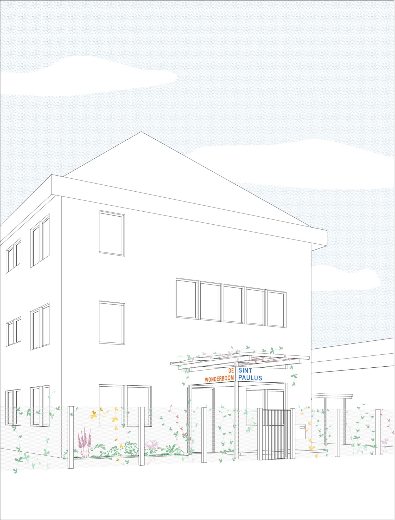 Een hoekgebouw tussen de Zwijnaardse Steenweg het Rerum Novarumplein articuleert de overmaatse, onderbenutte ruimte in een groen plein voor de kerk en een tweede plein tussen school en kerk. De begane grond wordt een sociaal restaurant, daarboven zitten twee lagen woningen aan een luchtige galerij. De woningen hebben terrassen achteraan, aan de zonnekant, maar een keuken vooraan, zodat het contact met het plein levendig blijft. De slaapkamers zitten afwisselend voor- en achteraan, zodat de beschikbare breedte optimaal gebruikt wordt. De eindwoningen, aan de steenweg en de school, zijn contextuele passtukken. Omdat het gebouw grenst aan de speelplaats van de Sint-Paulusschool, worden de speelplaats en de toegang opgefrist en vergroend.