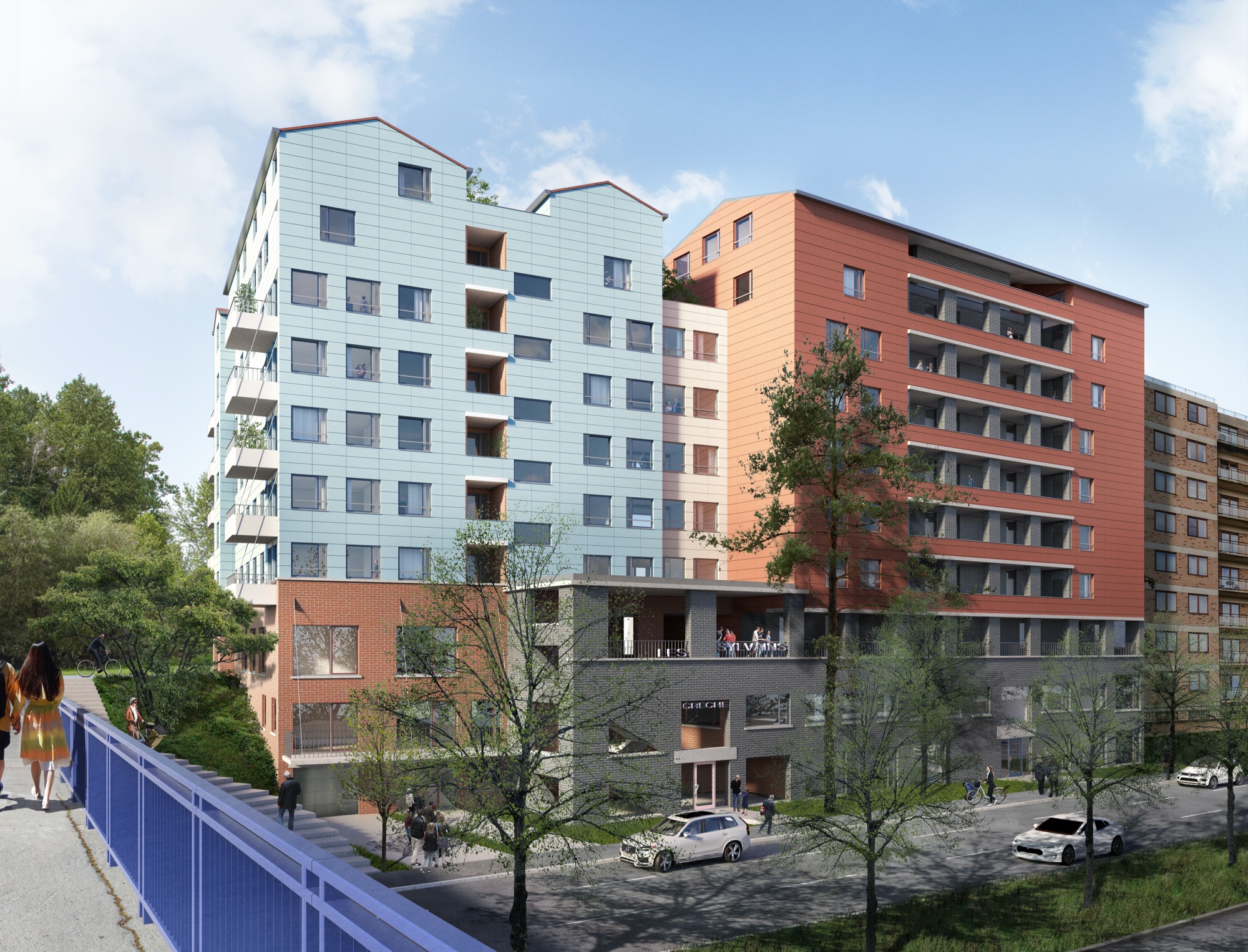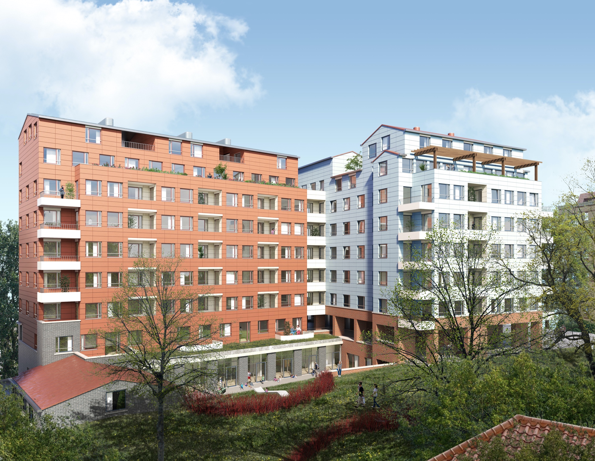 Naast ons perceel sluiten de appartementsblokken aaneen tot een monotone rij, maar de passerelle vraagt om een hoek. Er ontstaan twee verbonden gebouwen, elk met hun adres, samen op een hoge sokkel, complementair in kleur en materiaal. Zo kunnen de hoge gebouwen huizen worden, geen kasten, gearticuleerd, hun kleine verschillen niet onderdrukt. We hadden de wijk Tiburtino in Rome in gedachten. In de laagte, aan de tuinkant heeft de crèche een bijgebouw dat naar de gemoedelijke schaal van het villaatje in het park verwijst.