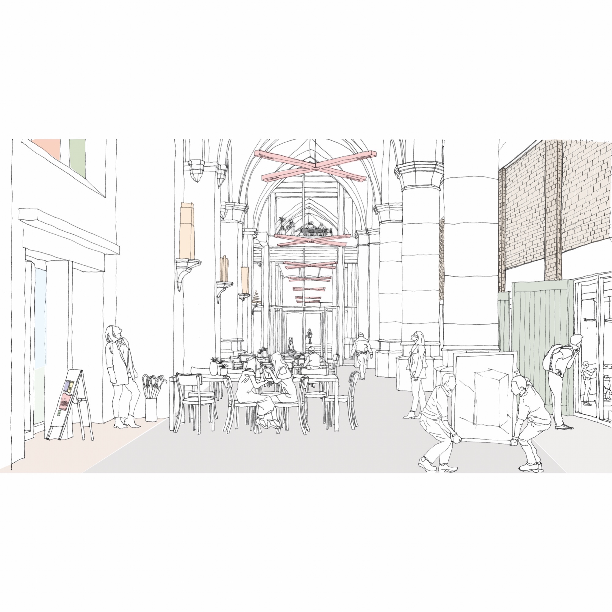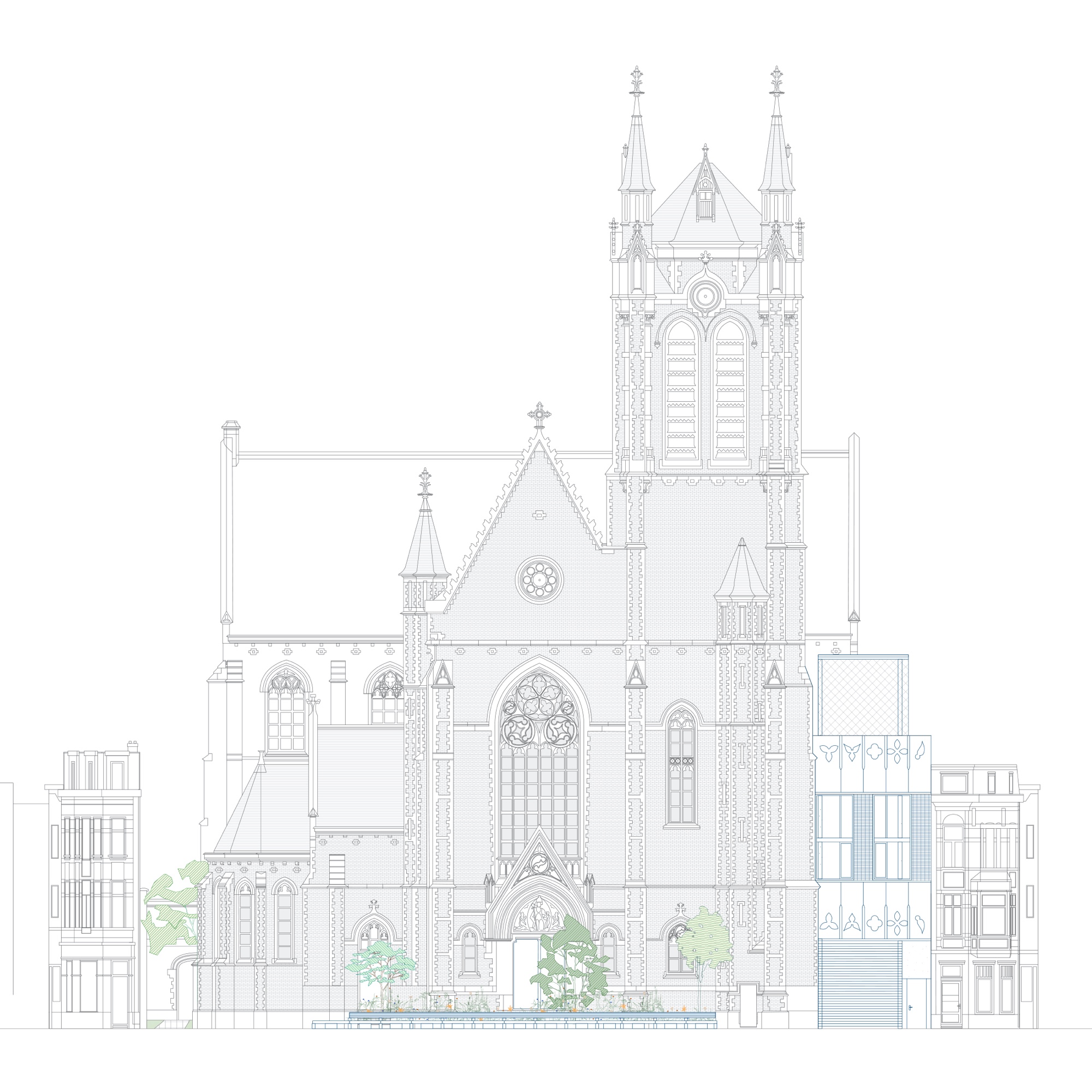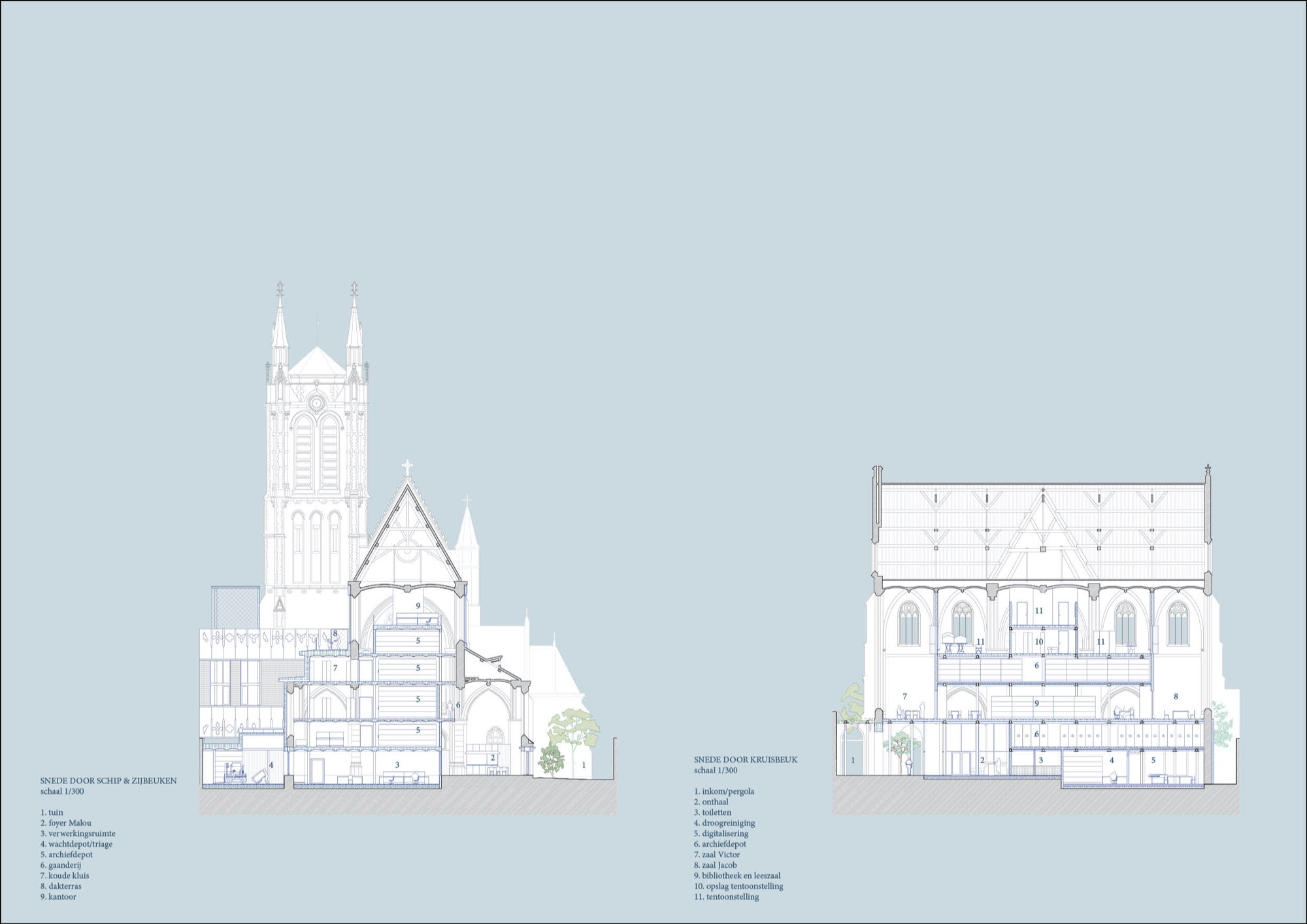 Vrije ruimtes met erfgoedtroeven – het koor, het oksaal, de uiteinden van het transept – omwikkelen het archief als bufferruimtes op een tussenklimaat. Ze zijn verspreid langs de drie publieke zijden: de Ferdinand Coosemansstraat, het kerkplein en Park Malou, een nieuwe groene ruimte langs de zuidelijke zijgevel voor gebruik door de buurt. In het midden daarvan, onderin het transept, zit de toegang. Het portaal op het kerkplein wordt een wintertuin, de arduinen kerktrappen worden omgebouwd tot een pleinsofa die uitkijkt op het plein. Waar de zuidkant van de kerk zich opent naar het nieuwe park, met mogelijks een eet- of drinkgelegenheid, sluit de noordkant tegen het bouwblok aan. Dat was al zo in de Coosemansstraat, we doen het nu ook aan het kerkplein, met een aanbouw met koetspoort en kantoren, open naar het plein. In het park geven nieuwe ramen in de zijgevel uit op de zijbeuk, nu foyer Malou geheten, waarachter de archiefbehandelingsruimte en de koetspoort zichtbaar worden. Passanten kijken dwars door de pakhuiskerk heen en vatten in een oogopslag waar het in Hubertus om gaat: cultureel kostbare leveringen, mensen aan het werk, ruimte voor ontmoeting, een groen en conviviaal Oud-Berchem.