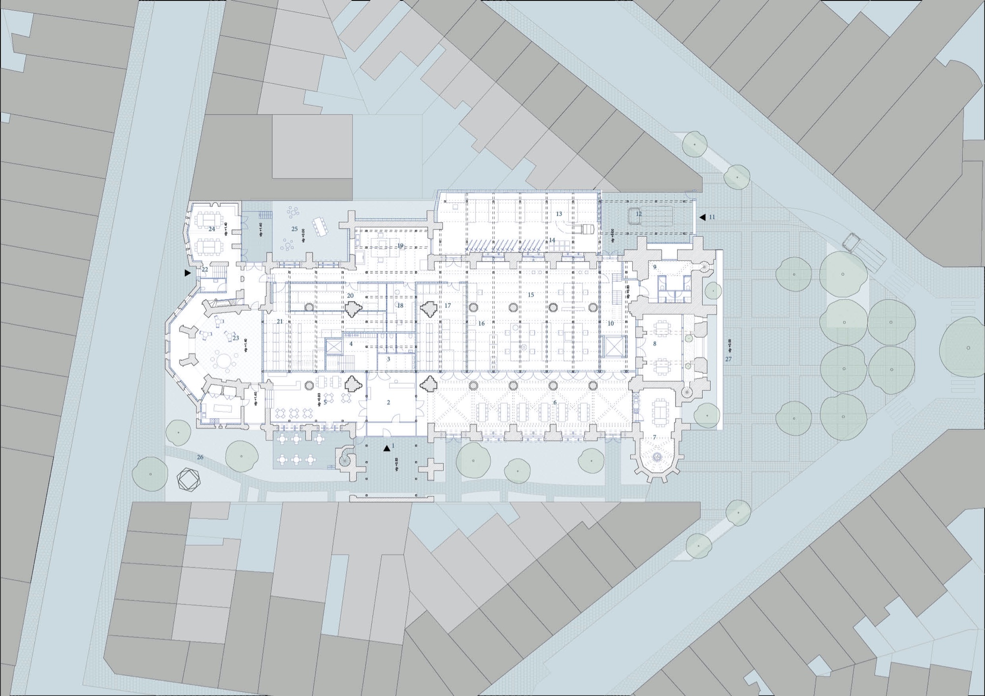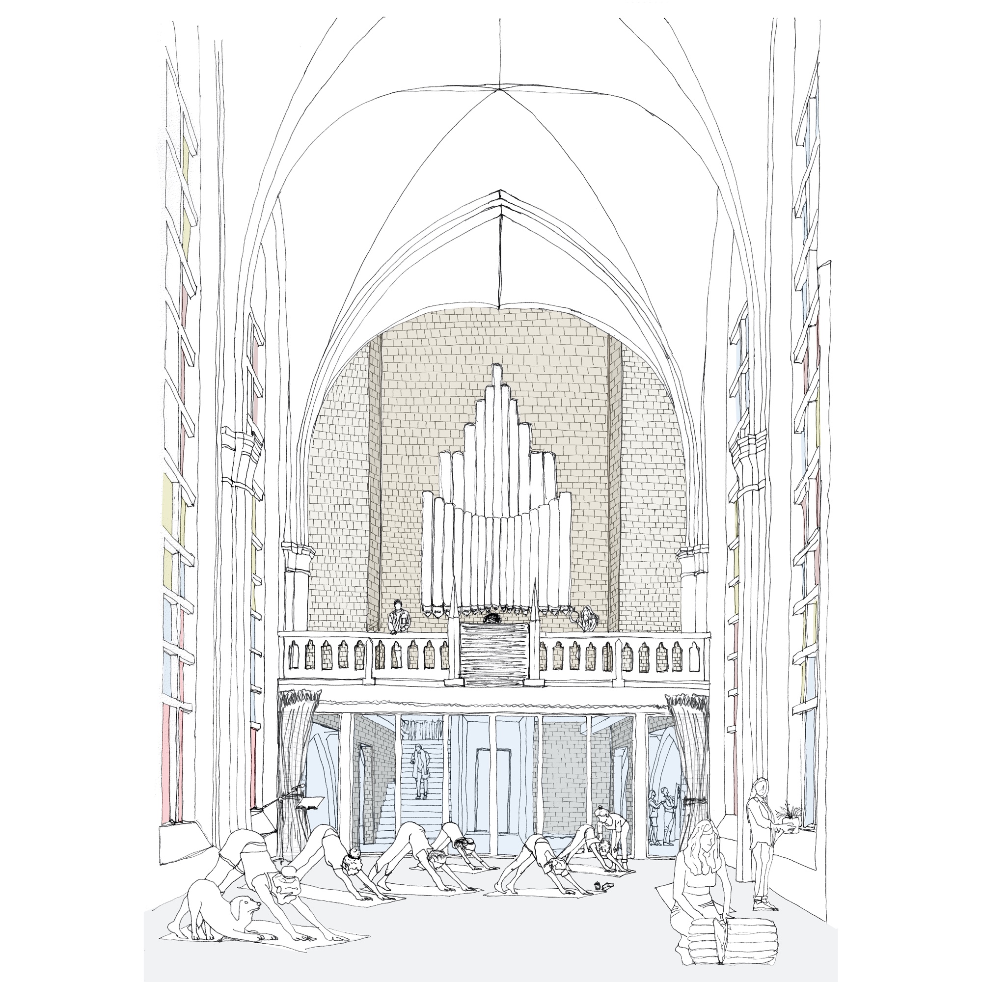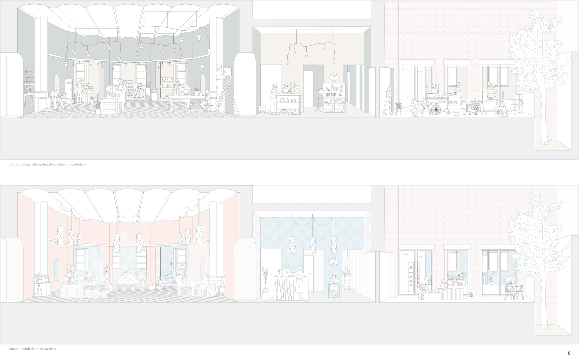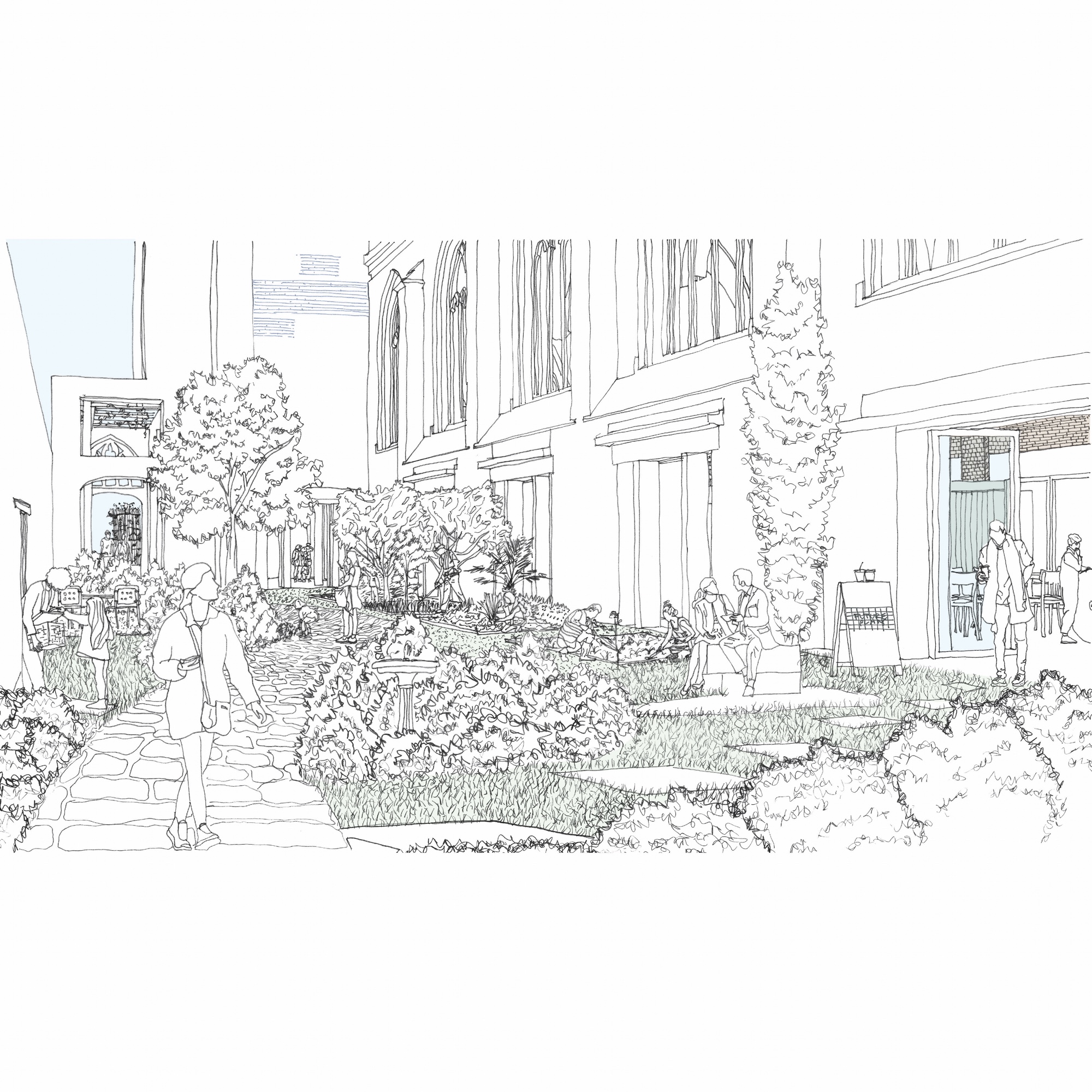Vrije ruimtes met erfgoedtroeven – het koor, het oksaal, de uiteinden van het transept – omwikkelen het archief als bufferruimtes op een tussenklimaat. Ze zijn verspreid langs de drie publieke zijden: de Ferdinand Coosemansstraat, het kerkplein en Park Malou, een nieuwe groene ruimte langs de zuidelijke zijgevel voor gebruik door de buurt. In het midden daarvan, onderin het transept, zit de toegang. Het portaal op het kerkplein wordt een wintertuin, de arduinen kerktrappen worden omgebouwd tot een pleinsofa die uitkijkt op het plein. Waar de zuidkant van de kerk zich opent naar het nieuwe park, met mogelijks een eet- of drinkgelegenheid, sluit de noordkant tegen het bouwblok aan. Dat was al zo in de Coosemansstraat, we doen het nu ook aan het kerkplein, met een aanbouw met koetspoort en kantoren, open naar het plein. In het park geven nieuwe ramen in de zijgevel uit op de zijbeuk, nu foyer Malou geheten, waarachter de archiefbehandelingsruimte en de koetspoort zichtbaar worden. Passanten kijken dwars door de pakhuiskerk heen en vatten in een oogopslag waar het in Hubertus om gaat: cultureel kostbare leveringen, mensen aan het werk, ruimte voor ontmoeting, een groen en conviviaal Oud-Berchem.