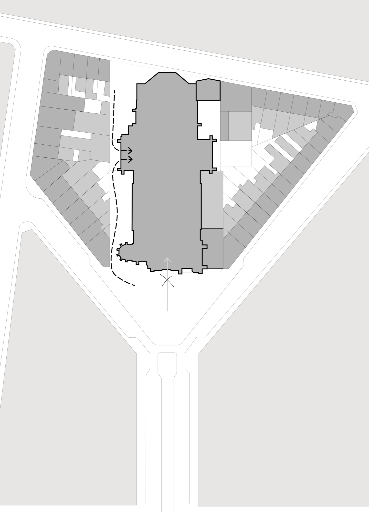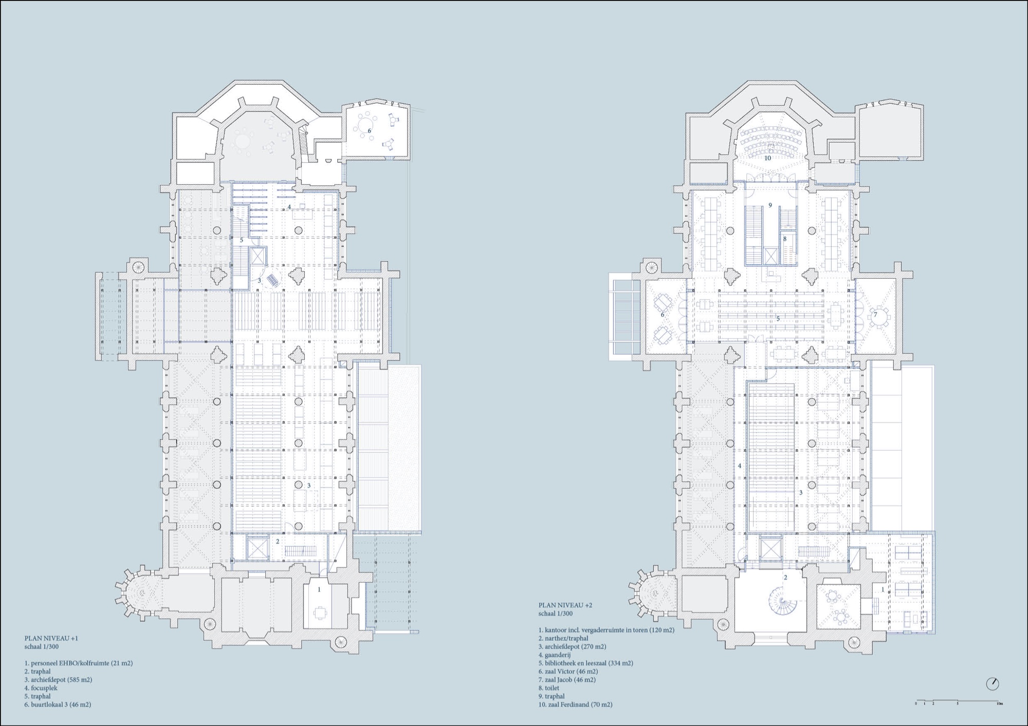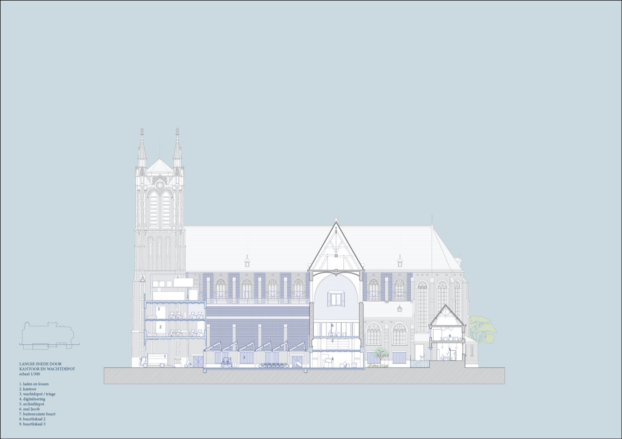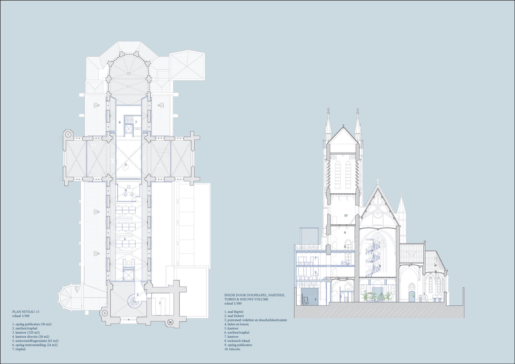 Onze formule voor de herbestemming van de Sint-Hubertuskerk tot architectuurarchief is een verbinding van twee referentieconcepten. Het eerste is het niet uitgevoerde concept van OMA voor de Très Grande Bibliothèque in Parijs: een vormeloze, volgestouwde opslagplaats, ontoegankelijk voor het publiek, waarin spectaculaire publieke ruimtes uitgespaard waren en verbonden door een parcours. Het tweede is de ruïne van de abdij van Villers-la-Ville, die voorbeeldig is omdat ze bevrijd is van het conventionele liturgische gebruikspatroon: niet langer gebonden door de centrale as kan je ze in alle richtingen doorkruisen. Door het verval zie je geen intact geheel meer, maar de resterende fragmenten spreken met des te meer kracht. Als beide concepten zich verbinden, hebben we een pakhuis in de vorm van een kerk, bevrijd van haar liturgische as, waar naarmate we er verder in doordringen zich beklijvende kerkfragmenten openbaren. Die verspreide deelruimtes laten ons toe om, zoals in de ruïne, de kerk mentaal weder samen te stellen. Er blijft dus veel vrije ruimte beschikbaar voor extensief gebruik, gedeeld gebruik en nevenbestemmingen. Zo wordt het archief een met de buurt gedeeld huis. Een participatieproces op maat van de superdiverse buurt gaat op zoek naar passende invullingen.