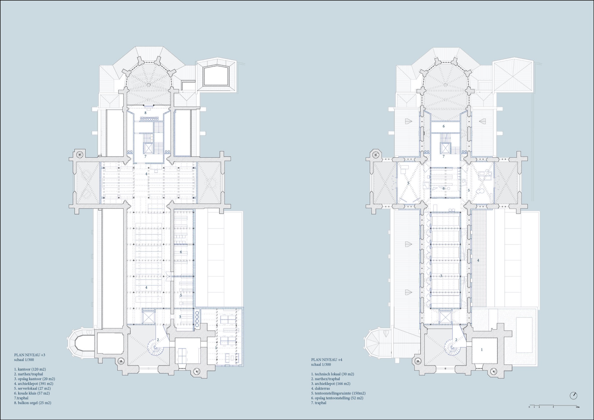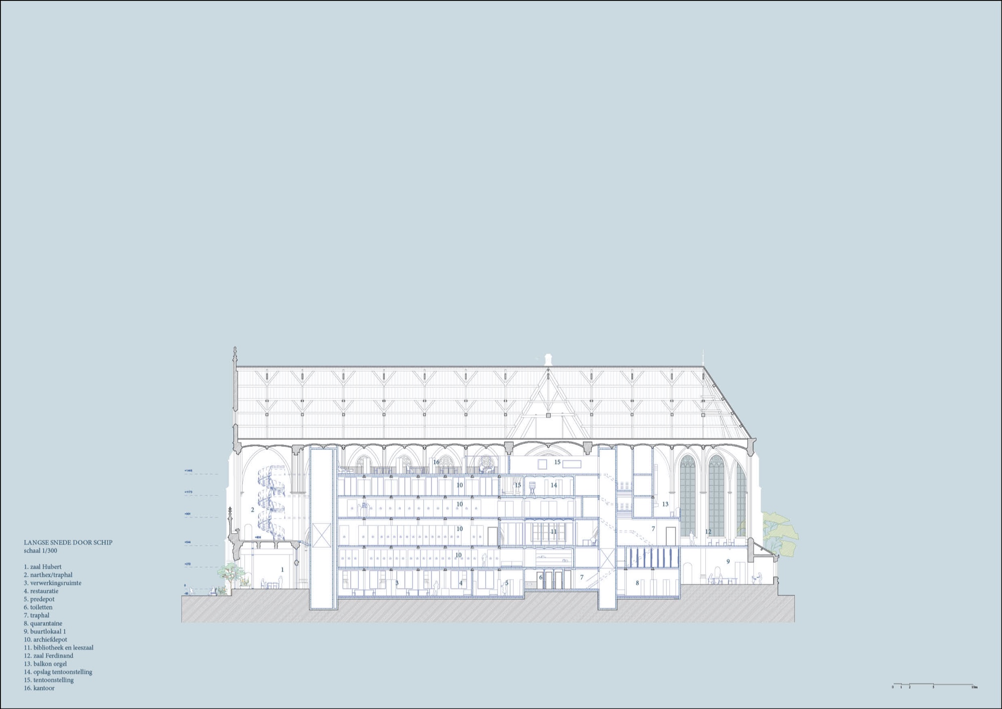 Een nieuwe structuur, zwaar genoeg voor het archief, vult het schip en de noordelijke zijbeuk: noord (pakhuis) en zuid (kerk) zijn de janusgezichten van de pakhuiskerk. Het archief beantwoordt aan het Denemarken-concept: de temperatuur blijft op peil niet door energie, maar door massa. Een staalskelet neemt het gewicht, de massa komt van invulmetselwerk in vochtregulerende blokken en van gewelfde vloervelden die zuinig omspringen met beton. De nieuwe structuur is even regelmatig als de oude, ze zijn mekaar waard. De vloerhoogtes variëren en zijn afgestemd op de bogen en kruisribben. De trappen die de leeszaal, de tentoonstellingssuite en de kantoren ontsluiten openbaren stap voor stap, als in een handboek architectuur, de horizontale en verticale dimensies, het licht, de kleur ervan en de sierlijkheid van de constructie.