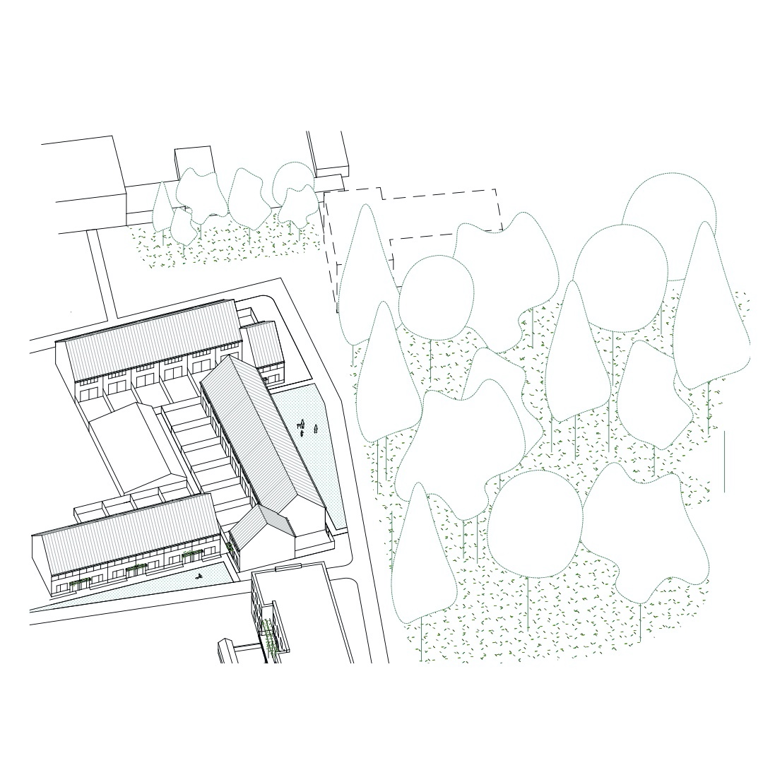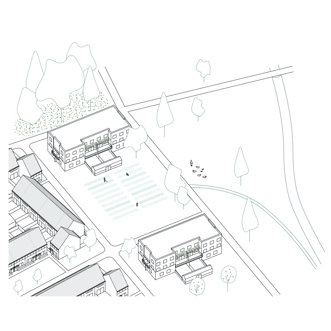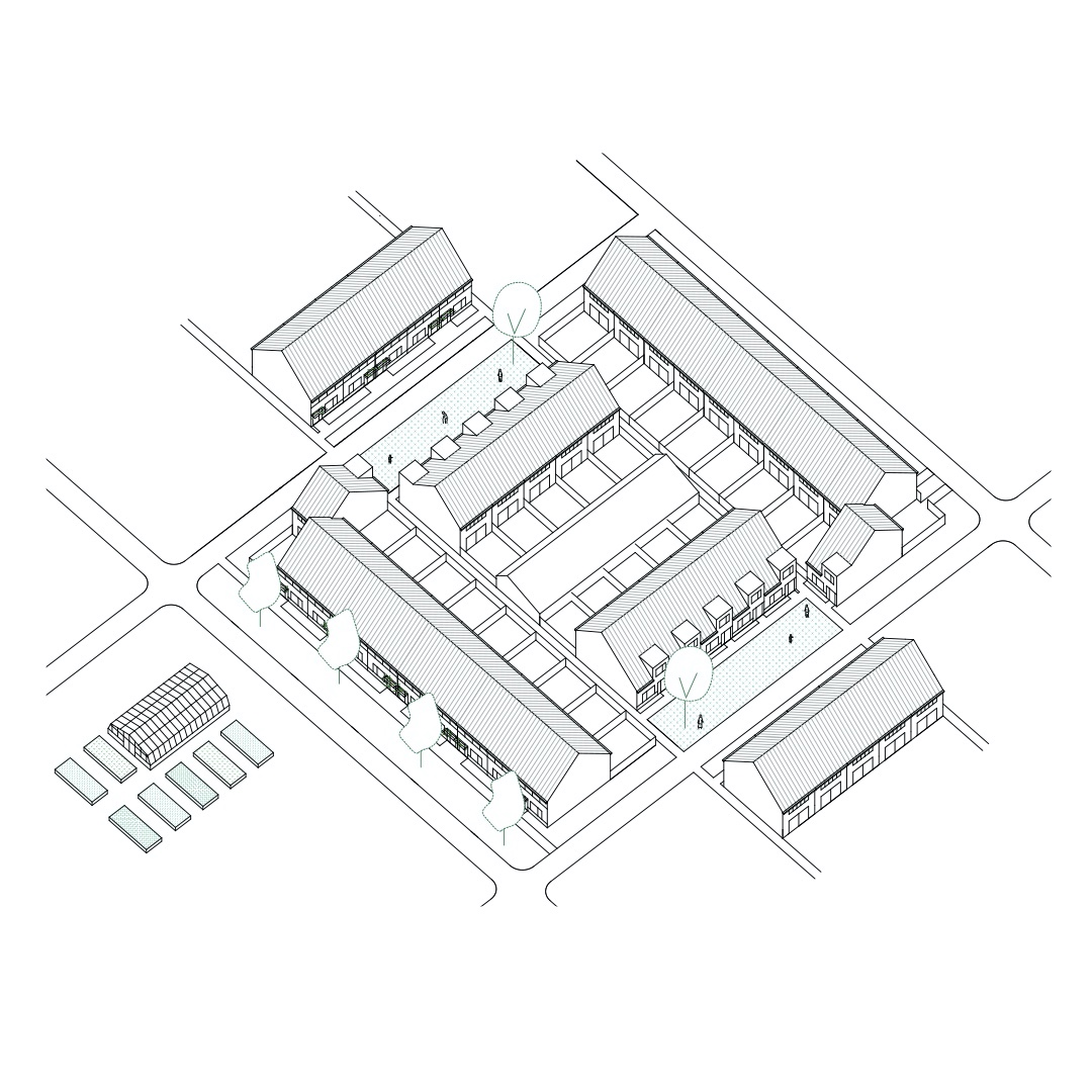 De overwegende bouwhoogte is drie lagen of minder, met alleen uitzonderingen voor de galerijflats aan plein en dries. Aan de straat en de klimaatas komen stapelwoningen, de wijk zelf bestaat uit bouwblokken van rijhuizen met kap. Aan de binnenkant zitten privétuinen en een hok voor fietsen, gereedschappen en de voeding van een energienet per bouwblok. Aan de buitenkant, tussen de voordeuren en de weg, zit een toeëigenbare, collectieve tuin: een accolade of mini-close, een herinterpretatie van een oud tuinwijkthema. Eén huis uit de rij keert om en sluit de mini-close af. Met tuinmuren op hoeken, kleurig horizontaal schrijnwerk, kleine verschillen, naar buiten gekeerd groen dat afsteekt tegen de warmgrijze tinten en een horizonlijn op 4 meter verwerft de wijk een eigen identiteit.